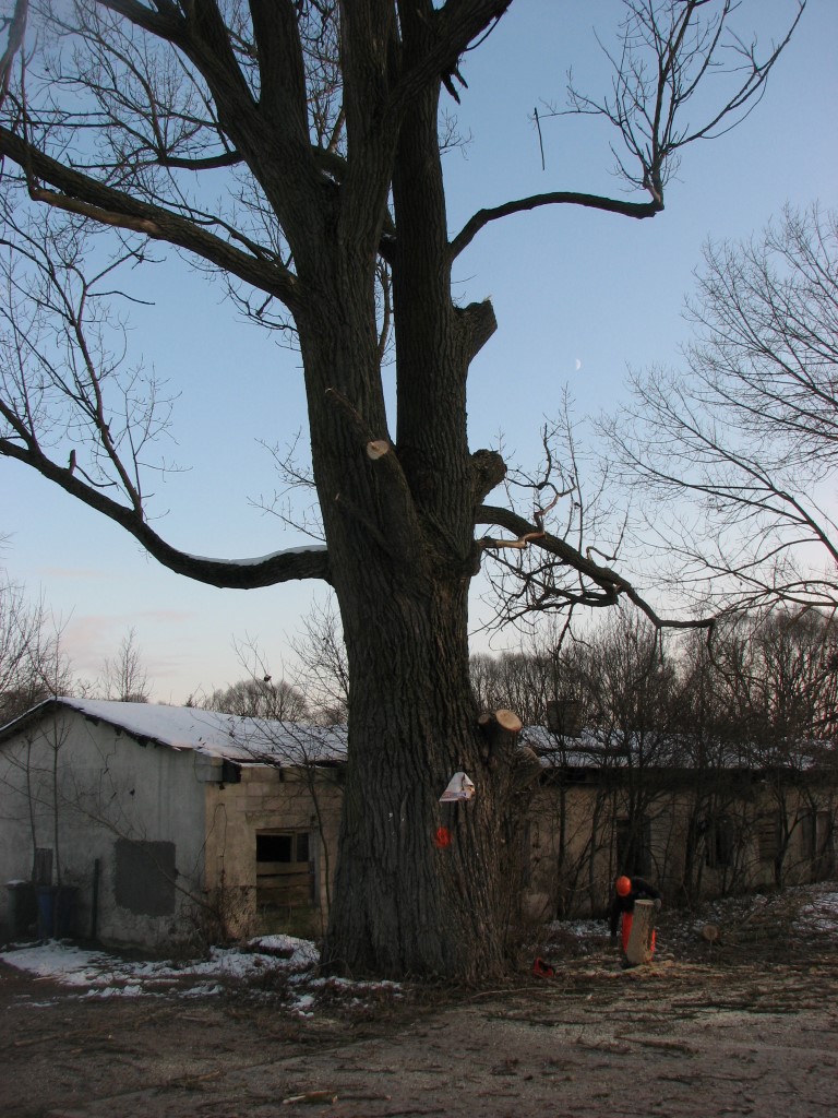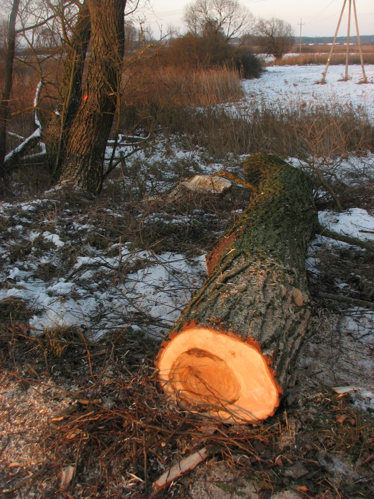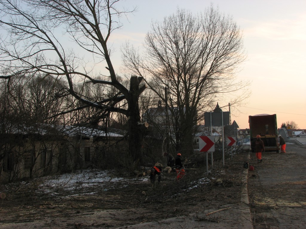 Muszę z przykrością zawiadomić o kolejnym temacie na stronę ET. Za mostem przy ul.Puchalskiego rozpoczęła się dziś wycinka dwu starych topoli. Jedna, bliżej mostu została w 1992 pokaleczona przez wichurę (odtąd nikt nie zadbał o usuniecie połamanych konarów), teraz ta topola oraz całkiem zdrowa na wprost pp. Świetorzęckich, przy dawnej brukowanej drodze do starego drewnianego mostu zostaną ostatecznie w poniedziałek wycięte. Decyzję powzięła gmina. Aha, jeszcze będą wycięte wierzby w kierunku zamku – wszystko w trosce o bezpieczeństwo podróżnych jak powiedział szef firmy wycinkowej.