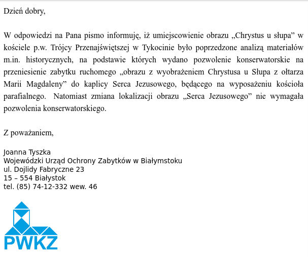 Uważam za nieuzasadnione przeniesienie obrazu Pana Jezusa u słupa z południowej kaplicy i likwidacja kaplicy Serca Pana Jezusa, drugiego obok kaplicy Matki Boskiej, sanktuarium tak bardzo czczonego przez parafian od chwili jego powstania w 1910 roku. Nie wiem, jak nazwać degradację obrazu Serca Pana Jezusa przez umieszczenie go tak, by wierni byli nań zwróceni tyłem. Jest to tak przykre, że brak słów, na wyrażenie bólu. DLACZEGO Z KRUCHTY ZNIKNĄŁ KRUCYFIKS? A czy portrety Branickich teraz lepiej są widoczne w muzeum, niż były w kościele, gdzie widzieliśmy je i fundatorzy Kościoła stale z nami byli? Nie rozumiem tych decyzji przeprowadzonych BEZ KONSULTACJI ze spadkobiercami dziedzictwa Branickich czyli zwykłymi ludźmi – wiernymi tykocińskiej parafii!!!
