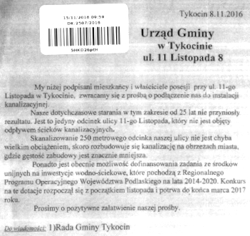 Minęło ponad 4 lata, gdy mieszkańcy domów przy ul. 11 Listopada w Tykocinie /począwszy od Urzędu Miejskiego do ul. Jordyka/, złożyli w Urzędzie Gminy prośbę o podłączenie do kanalizacji ściekowej.