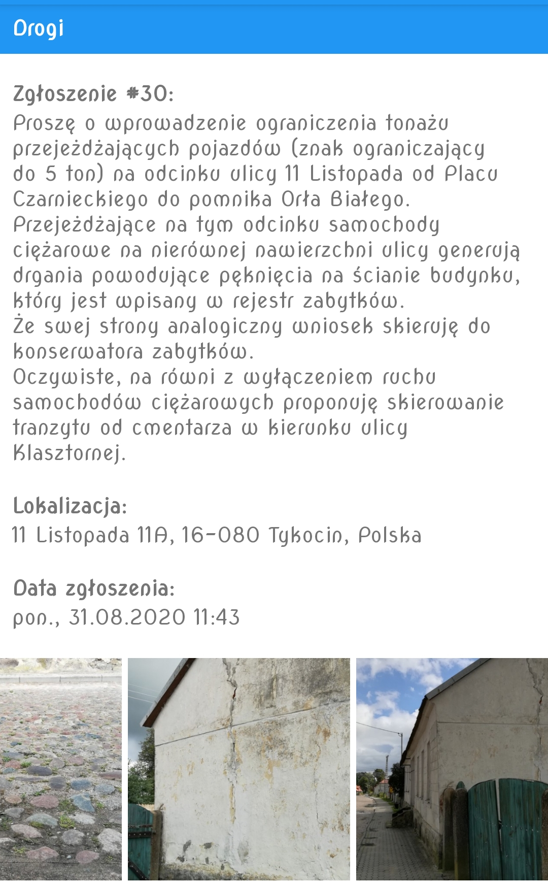 Zostając przy temacie odcinka ul. 11 Listopada w Tykocinie /począwszy od Urzędu Miejskiego do ul. Jordyka/, ze swej strony, korzystając z aplikacji mobilnej LUPE, zgłosiłem potrzebę wyłączenia tego odcinka ulicy z ruchu samochodów ciężarowych. Zgłoszenie do tej pory ma status nieprzyjętego / a konkretnie status NOWE/, inne jak np. awaria oświetlenia ulicznego ma status: PRZYJĘTE.