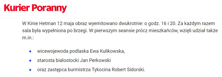 z niepotwierdzonego info – pokazów w Tykocinie mogło być więcej, tylko fundację było stać na wykupienie sali kinowej na dwa; Nikt z dwojga instytucji w/w nie pomyślał że przeciętny Tykocinianin chciałby zapłacić za bilet wstępu by być na pokazie przedpremierowym, proponowane godziny seansów 10, 12, 14, 16, 20, spotkanie z twórcami filmu jak w programie, i jeszcze załapaliby się chętni spoza naszego Miasta, sala kinowa na pewno nie świeciła by pustakami, to przecież zarobek dla kina, pozbycie się kosztów dla Fundacji, i jakie wydarzenie kulturalne dla Tykocina!!! Podsumowując, czuje się wyparcie na kulturę w Tykocinie, przez takie zachowanie instytucji kulturalnych, które po partyzancku urządzają pokaz filmu; latem „3 strzały” dużego kalibru (Królewskie Śpiewanie, Nadzieja w Chórze, kino plenerowe) nie wystarczą, co dalej do następnego lata? Tykociński Teatr Amatorski nie ma miejsca na próby, kino nie kwapi się z udostępnieniem miejsca, to po co ono komu?