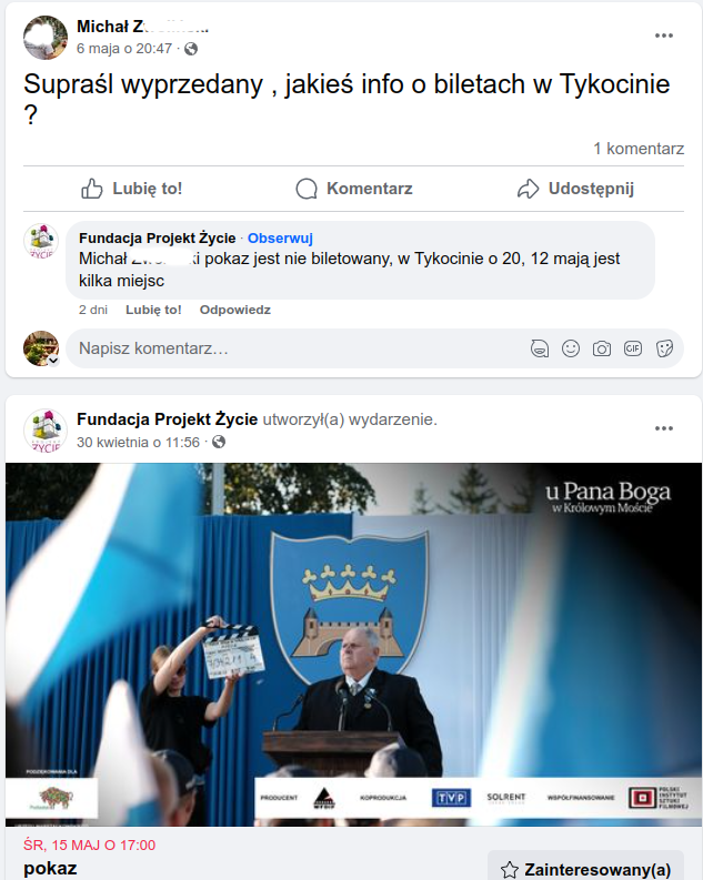 pokaz niebiletowany w Tykocinie o 20,jeszcze są -to info z dyskusji sprzed 2 dni w wydarzeniu;