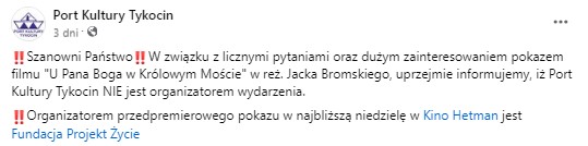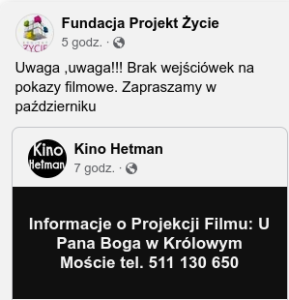 proszę nie dzwonić na ten numer, został opublikowany przez kino Hetman bez zgody właściciela t.j. organizatora pokazu filmu, Fundację Projekt Życie, która po jakimś czasie na swoim fanpage opublikowała to:
